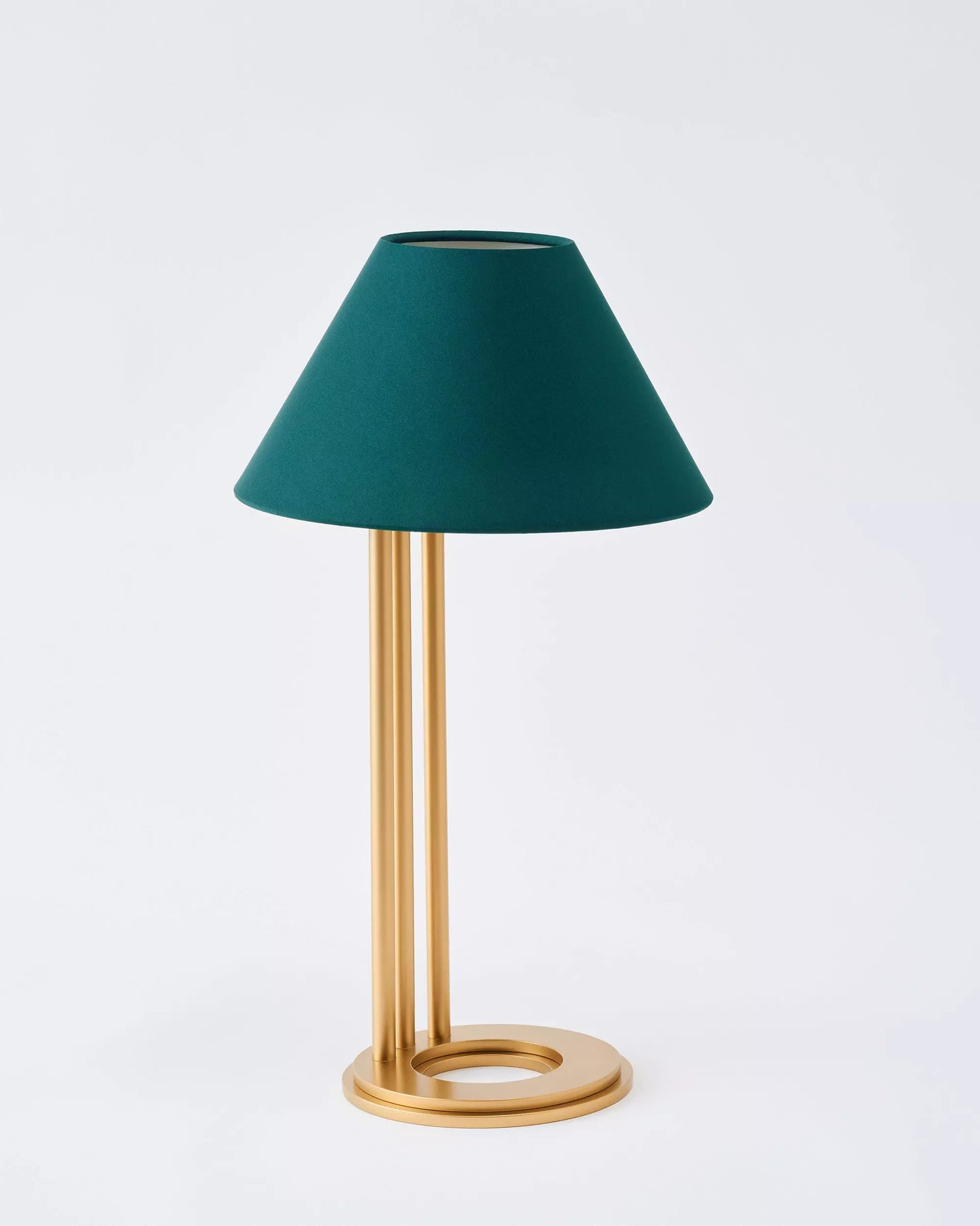 Interamente in metallo e verniciata nella colorazione dell’ottone, è fornita di un paralume intercambiabile in tessuto che si adatta ai diversi ambienti e ai diversi gusti personali. Inoltre, il corpo illuminante è rimovibile affinché possa essere ricaricato senza dover dislocare l’intero oggetto.